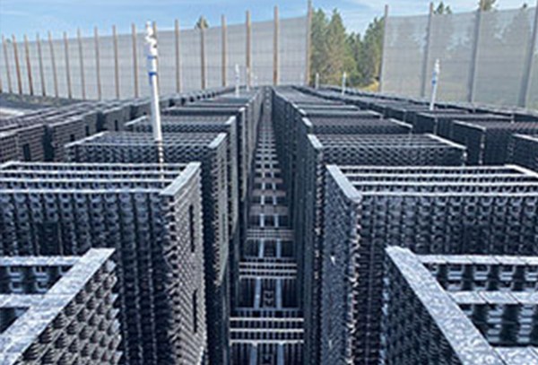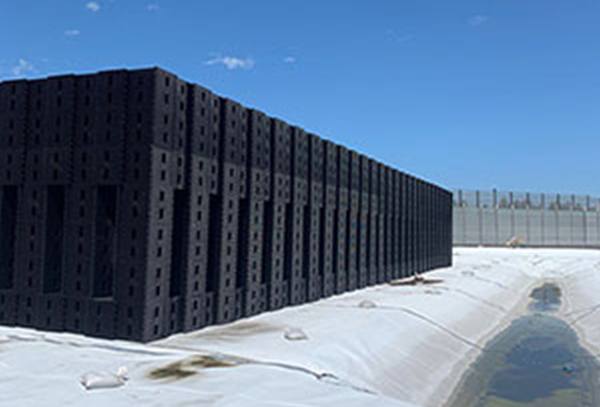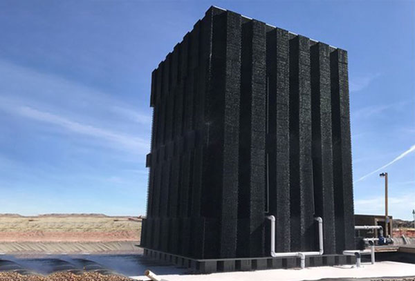 ECOVAP’s “Evaporative Matrix™” (“EMs™”; see picture) are easily installed, relocated, or removed – in weeks rather than months or years. The Matrices are custom-assembled in Lego-like construction using thousands of identical, interlocking panels. The structures can be built on location where the wastewater is generated, thus dramatically reducing the cost of transportation to a disposal or recycling facility. With the biomimicry of natural evaporation, there is practically no energy used or operating costs (i.e., vs. conventional methods such as thermal heating, chemicals, or pressure pumping into sprayers, membranes or injection wells), except for occasional low pressure pumping to the top of the Matrices.