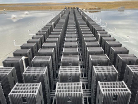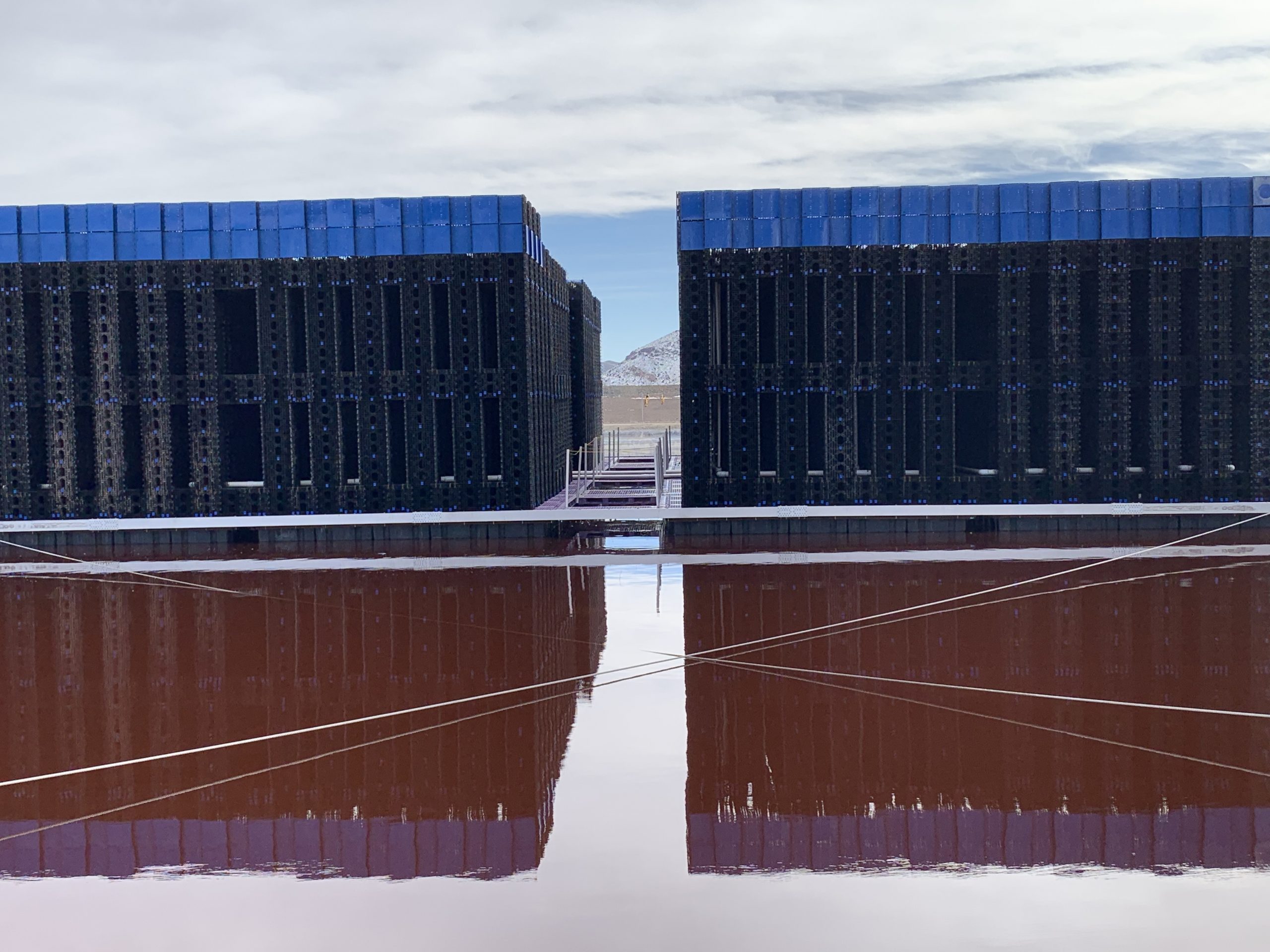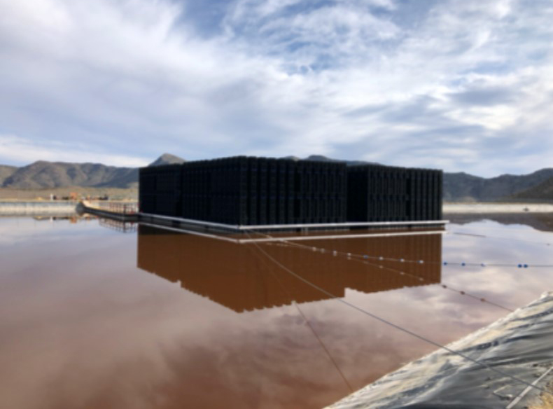 The client is a large metal mine with a ZLD requirement seeking to increase production capabilities. The mine had previously built four (4) large conventional evaporation ponds that occupied all of its permitted land, thus capping production. As is typical of many mining operations, this mine is remotely located, with limited electricity and no nearby wastewater disposal sites. Without changing its land footprint, ECOVAP was able to build multiple Evaporation Matrices directly on the pond (“EM-Floats™”). The EM-Float design targets evaporation ponds that already exist, and enables the Evaporation Matrices™ to rest atop specially designed pontoons on the surface of the ponds. The EM-Floats™consume a small fraction of the electricity of atomizing sprayers. The system is also connected to large cables to ensure stability for high-gusty winds in the region.